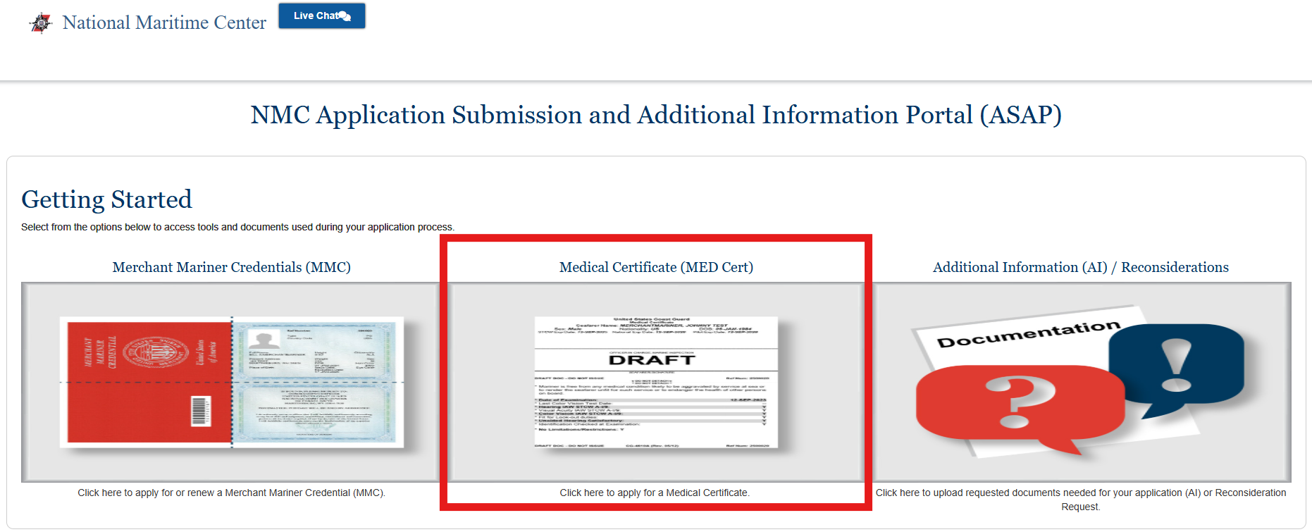 For your CG-719K, you will be applying for your Medical Certificate under the Medical Certificate (MED Cert) within the NMC Application Submission and Additional Information Portal (ASAP).
