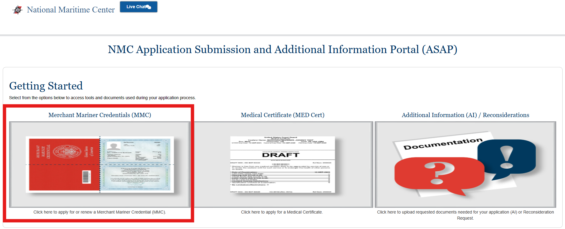 As of January 26, 2026, the National Maritime Center (NMC) now uses NMC Application Submission and Additional Information Portal (ASAP) as the primary method for submitting applications and additional documents for both new and existing applications. You will receive an email confirmation once your files have been successfully submitted.